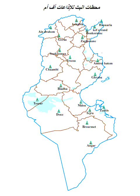 شبكة بث تناظرية أف أم تغطي التراب التونسي ، وتحتوي على 21 مركزًا رئيسيًا بالإضافة إلى محطات ثانوية ، وتضمن هذه المحطات بث البرامج الإذاعية على مدار 24 ساعة في اليوم ، ولكل إذاعة مجال تغطية تعاقدي وفقًا للإجازة الممنوحة من قبل (الهايكا).